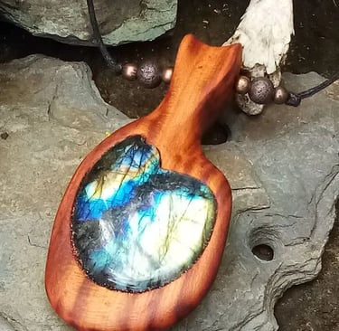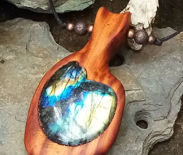 All items are made by hand and tools which are powered only by wind and solar. Each piece is unique and individual, enhancing the beauty of the tree wood, gemstone or feather chosen.